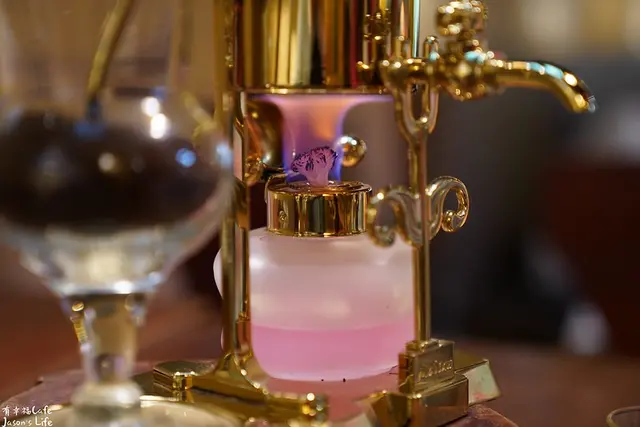點燃酒精燈後,加溫時利用虹吸的原理,將壺中的熱水吸至一旁的咖啡粉壺裡
