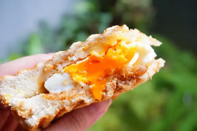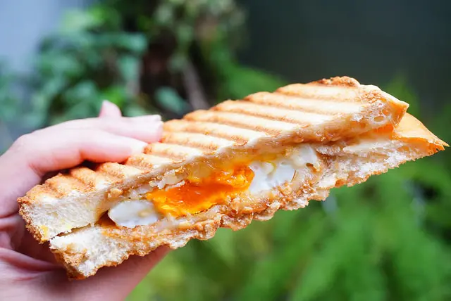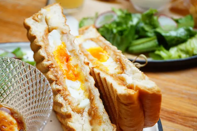 兩片厚片吐司加上花生醬、起司和半熟蛋