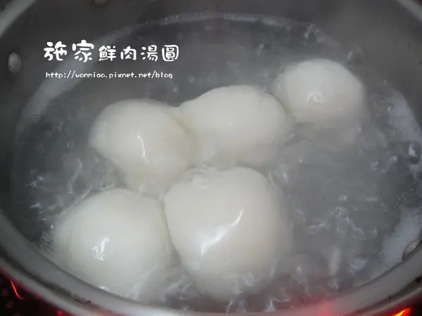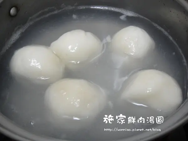 鍋中加入少許水, 或是到市場買貢丸時可以跟店家要點丸子高湯, 用高湯煮滋味更讚!待水滾, 放入湯圓直到水煮滾, 記得要不時攪拌一下以免沾住鍋底.