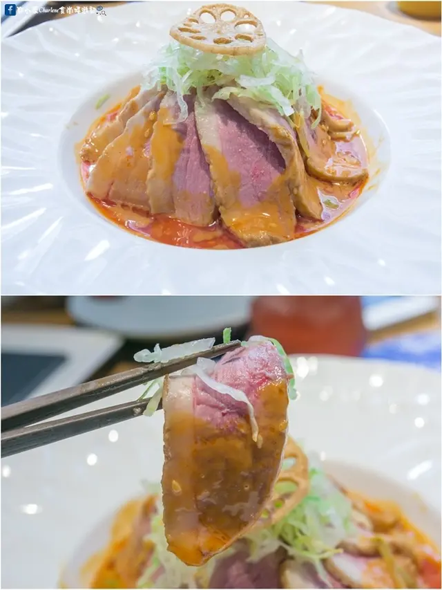吸睛的特調橘色醬汁,搭配鮮嫩的鴨肉片,