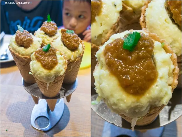 冰淇淋甜筒內,裝滿特製馬鈴薯泥、水果及生菜,