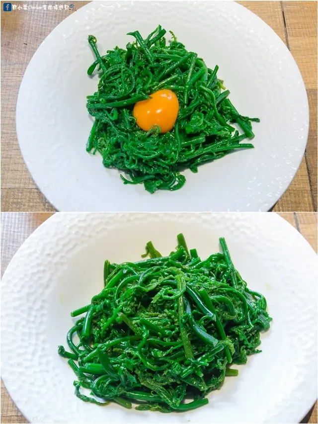 清燙翠綠鮮菜,綴以新鮮生雞蛋,攪拌後即可食用,