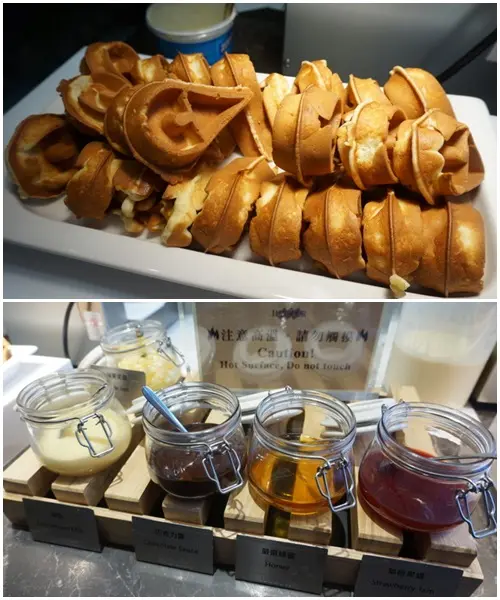 鬆餅有煉乳、巧克力、鳳梨百香果以及草莓醬可以加,