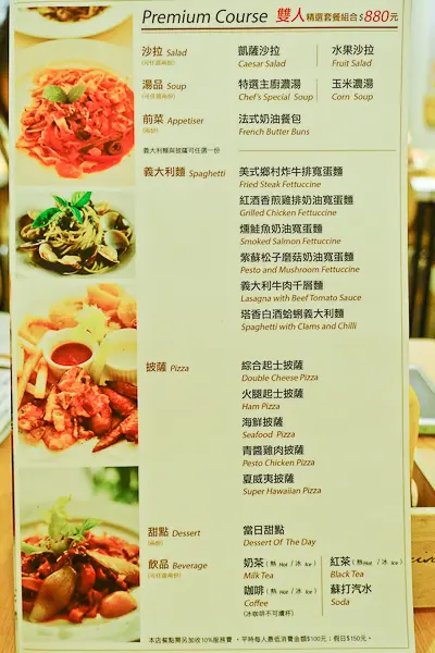 可選擇雙人份的沙拉、湯品、前菜-法式奶油餐包及主餐-義大利麵(六種口味)或披蕯(五種口味)任選其二,