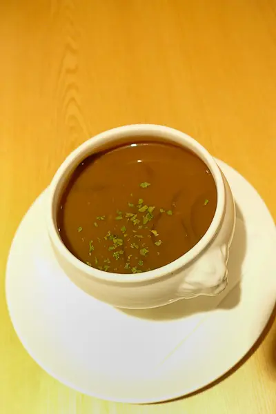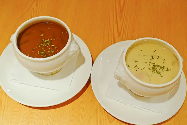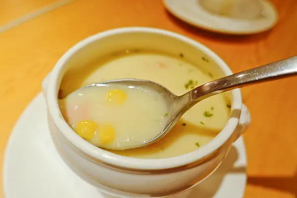 玉米湯口感濃郁,甘美滑順,洋蔥湯稍微清淡些,很順口。