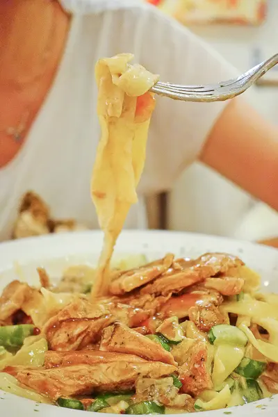 大量的雞胸肉跟厚實的寬蛋麵,雞胸肉處理得還不處,軟嫩有彈性,