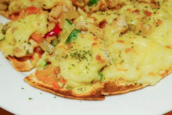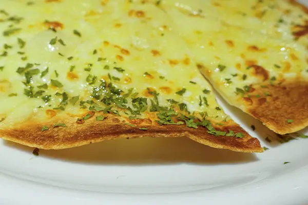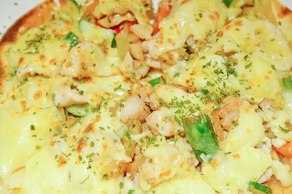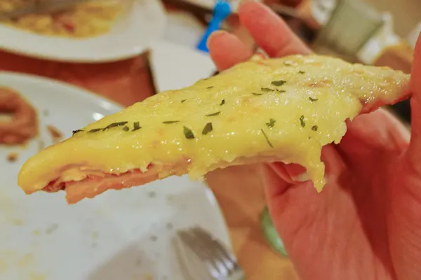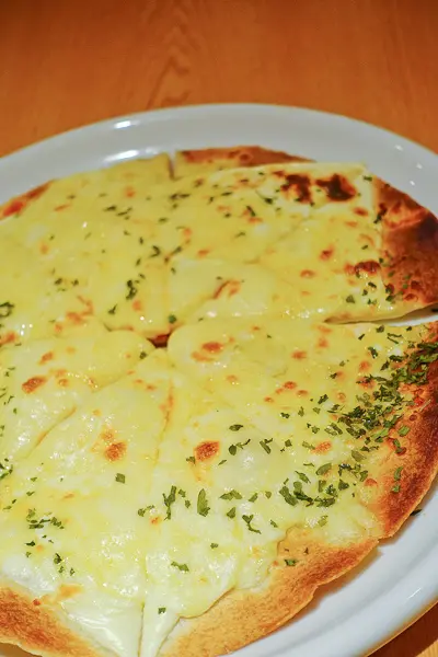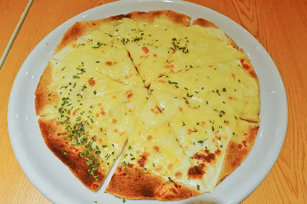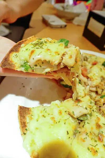 微焦帶褐的薄片披蕯,鋪滿嫩黃起司灑上些許綠色香草屑增香添色,