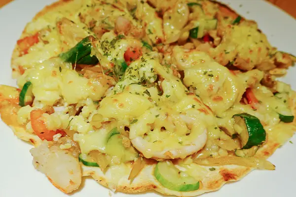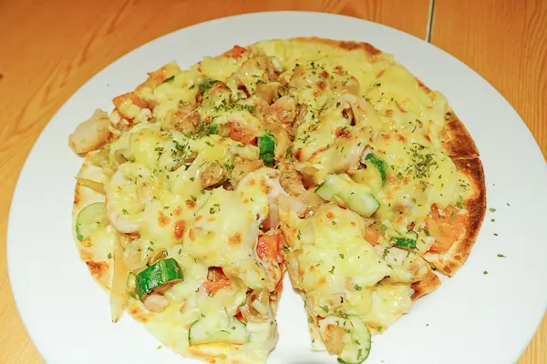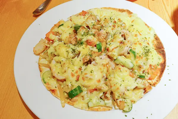 蓋滿披蕯的蝦、花枝圈、貝類(?)、瓜類、洋蔥、番茄等再加上濃濃的起士……