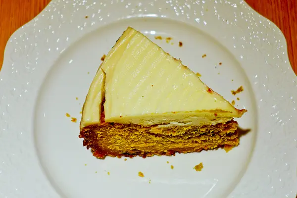 蛋糕呈現柔和的淡紅褐色澤,質上頭淋上溫潤的黃色優格奶醬,