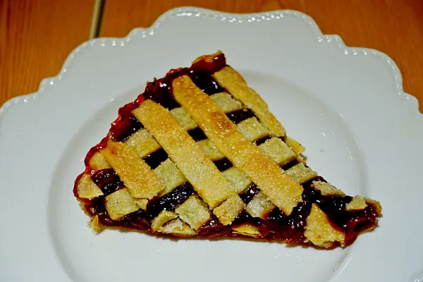 這道水果派有著金黃微褐烤至酥香的交叉條狀餅皮,內餡是豔麗的深紅色,