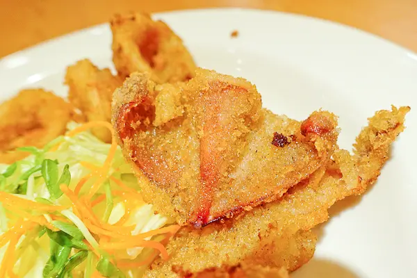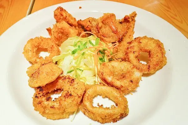 份量給得滿大方,中間搭配生菜沙拉,外皮金黃,口感香酥,花枝肉質結實有咬勁,