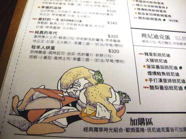 之前來已經吃過漢堡、披薩和義大利麵,還沒吃過鄰居家的早午餐,所以就點了「美好的一天」早午餐,裡面有我最愛的厚鬆餅,而且又是新餐點,毫不猶豫就點了呀。點餐的時候眼睛就會特別亮,看到餐點名稱前有"new"的字眼,就會多看幾遍,有新菜色當然要嘗鮮囉。