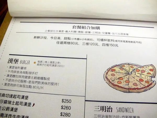 主餐部分點漢堡、義大利麵、燉飯、披薩、三明治和兒童餐都可以加購變成套餐,加購組合有新鮮沙拉、每日湯品、甜點(小布蕾 or 小布朗尼)、可續杯飲料(或可折抵其他飲品70元),以上任選兩樣加80元,選三樣加120元,四樣全選則是加150元,很喜歡這樣彈性的餐點搭配,可以依想吃的分量來做選擇喔!