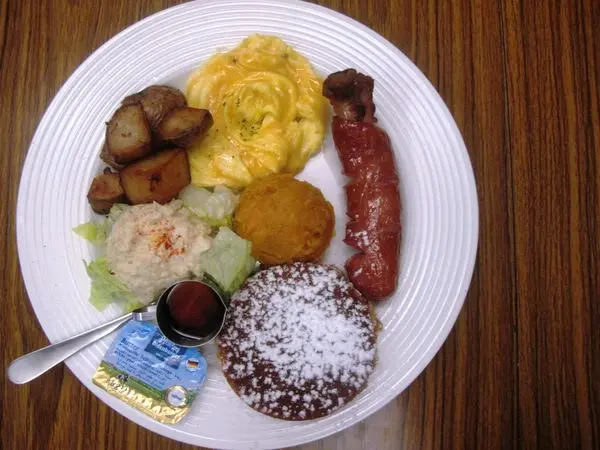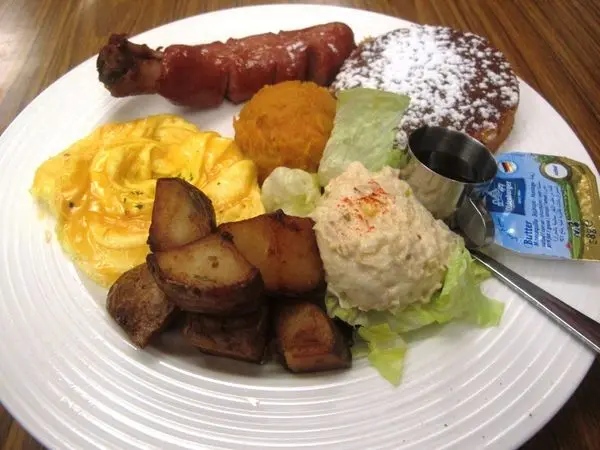 「美好的一天」除了有厚鬆餅,還有鮪魚沙拉、炸馬鈴薯塊、地瓜泥、帶骨臘腸、炒蛋等食材,十分豐盛,感覺吃完就元氣滿滿呀!「美好的一天」早午餐在菜單上有註明製作時間約要20分鐘,不過當天可能有點前菜,感覺也不會等很久,而且美食是值得等待的啦(笑)。早午餐餐點也很豐盛,感覺吃完就元氣滿滿呀!