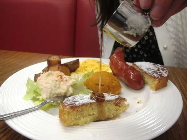 楓糖漿流到厚鬆餅的瞬間,整個頭都暈了呀,超誘人的,刀叉都準備好了呀!微甜香濃的楓糖漿搭配富奶香有嚼勁的厚鬆餅,簡直絕配!