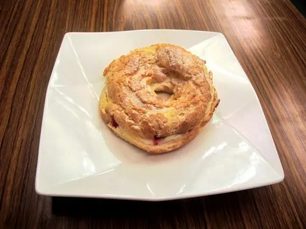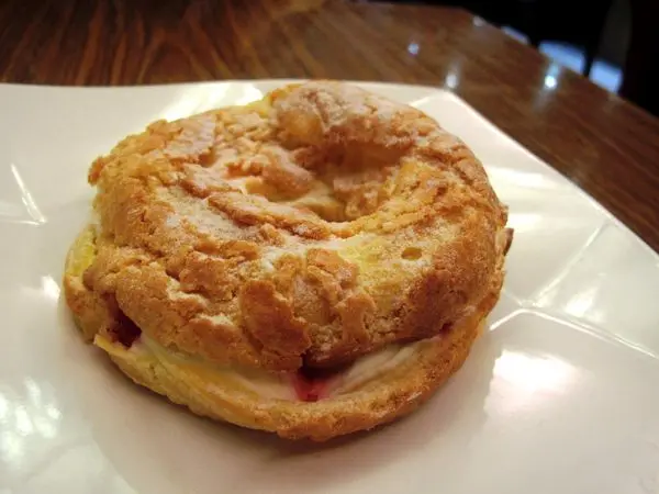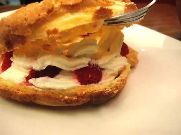 脆皮泡芙的外皮很像奶酥,酥酥脆脆的。打開來看看,裡頭是滿滿鮮奶油和草莓喔,鮮奶油冰冰涼涼的口感好像冰淇淋,原以為這麼多奶油吃起來會很膩,沒想到搭配酸甜有勁的草莓,中和的剛剛好,不會太甜膩,蠻好吃的呀!