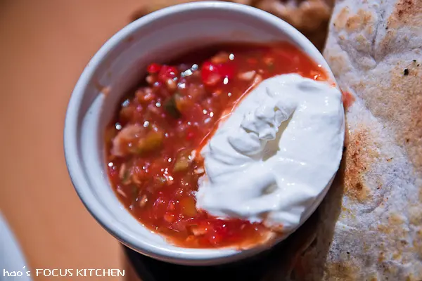 鮮紅的醬汁中滿是洋蔥、辣椒、番茄等蔬菜丁,配上開胃的雪白酸奶。
