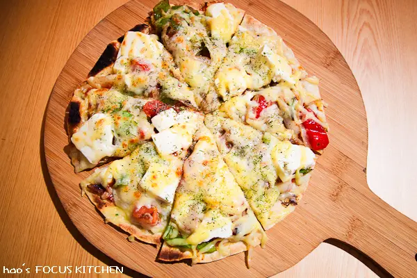 薄脆的餅皮鋪滿豐富的番茄、羊奶起司、黃瓜等餡料。