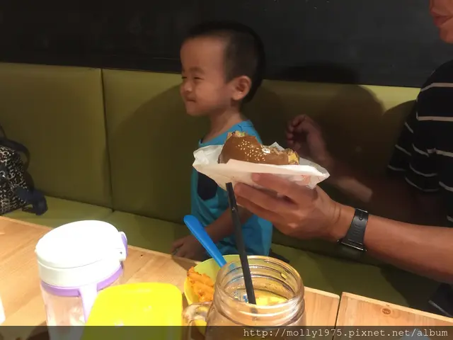 孩子也學我們咬一口漢堡,整個很嗨心ㄟ...雖然只咬一小口漢堡。