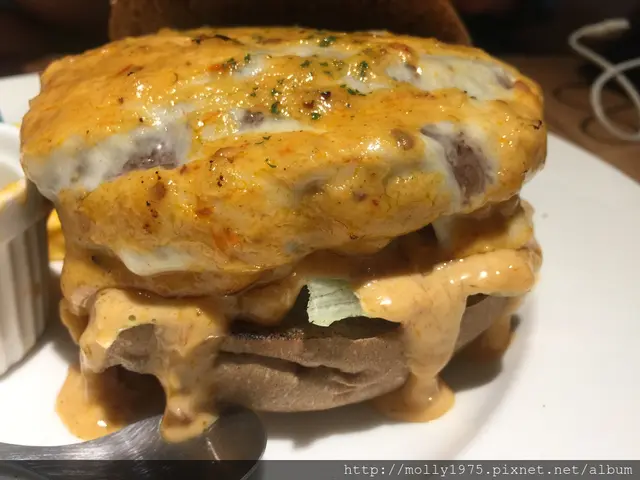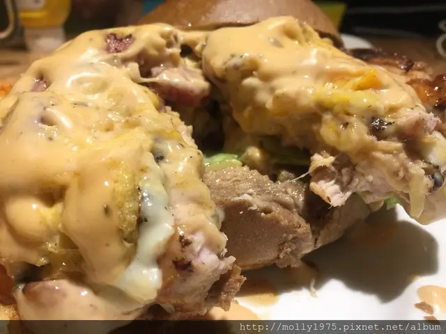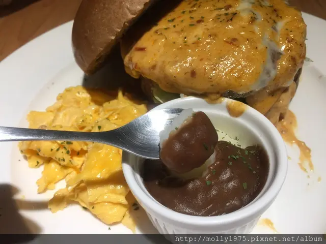 厚厚的牛肉,又有大量的起司以及辣味的蟹肉醬,整個在視覺效果上就很加分阿。
