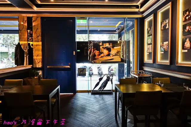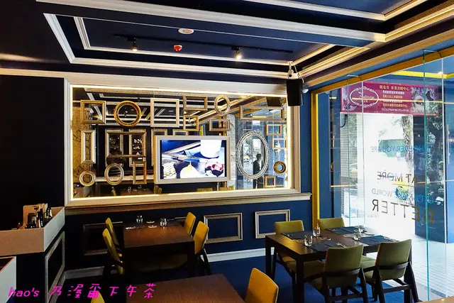 餐廳的空間寬敞,以深藍天花板、牆面搭配金色框架,鮮明的對比令人留下深刻印象,