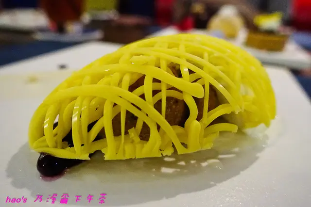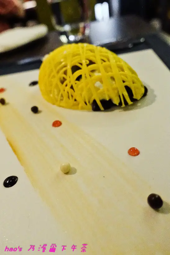 纖細的絲條狀芒果巧克力,層層交織而成亮黃色的飽滿半蛋型,上桌時飄散著淡淡芒果香氣。