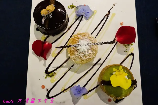 上桌時以巧克力醬及百香醬繪製線條,灑上各色花瓣及綠色開心果碎,