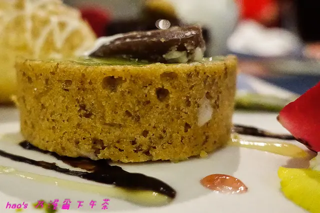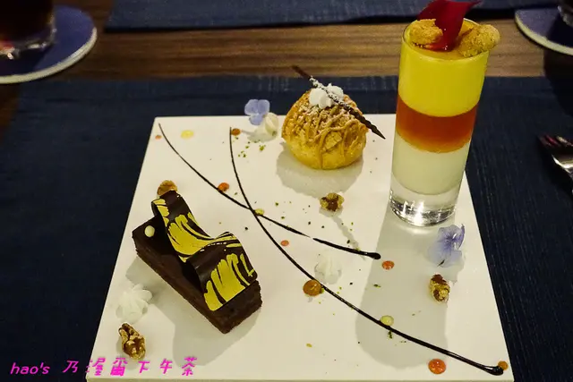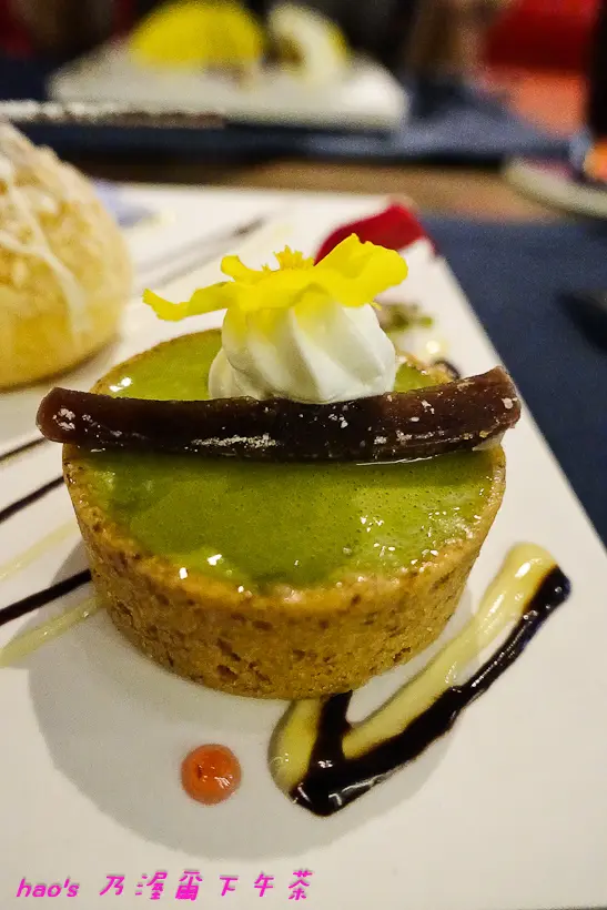 襯著不同形狀、顏色各異的甜點,濃褐、淡黃、濃綠綴上黃色蘭花,真的好優雅、好漂亮QQ