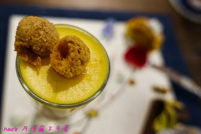 芒果慕絲甜美柔滑略呈固體狀,有馥郁的芒果香氣,