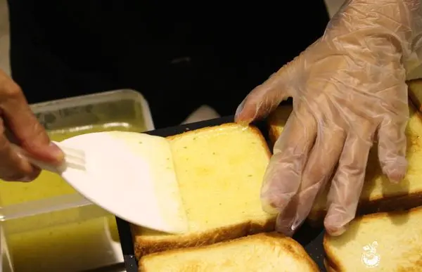 ▲在煎之前會先在鐵板上刷上一層來自韓國的奶油,服務人員觸摸食物的手都有戴手套,且戴手套的那隻手是不會去觸碰其他東西或器具的,如果不放心可以站在前面監督緊迫盯手(這樣被客人行注目禮(?)感覺店員壓力會很大...)