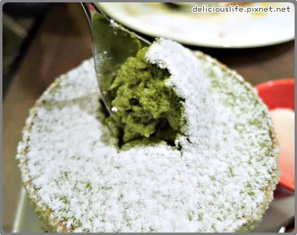 外皮口感微酥,內部非常濕軟,抹茶混合著雞蛋香氣,甜度不高