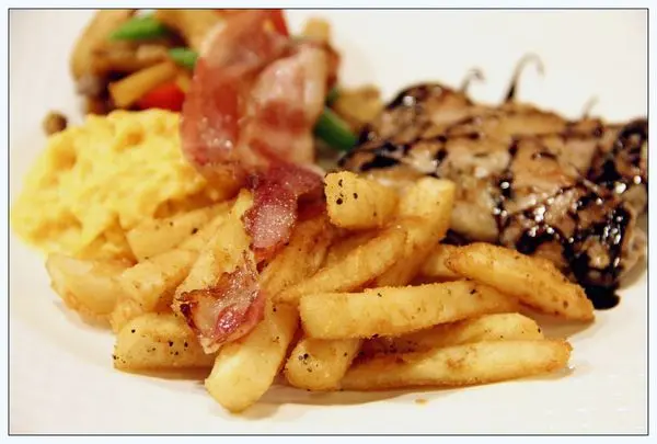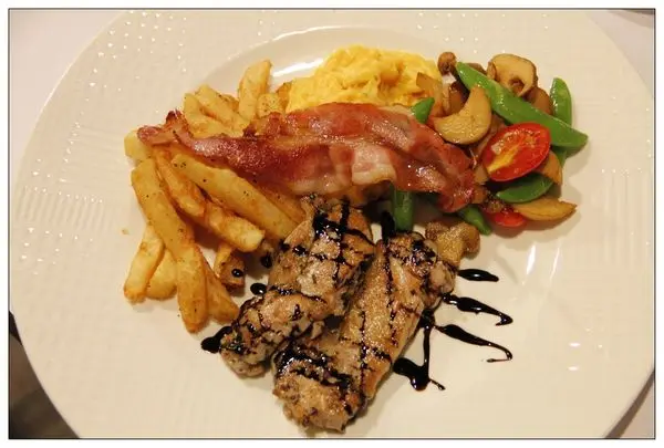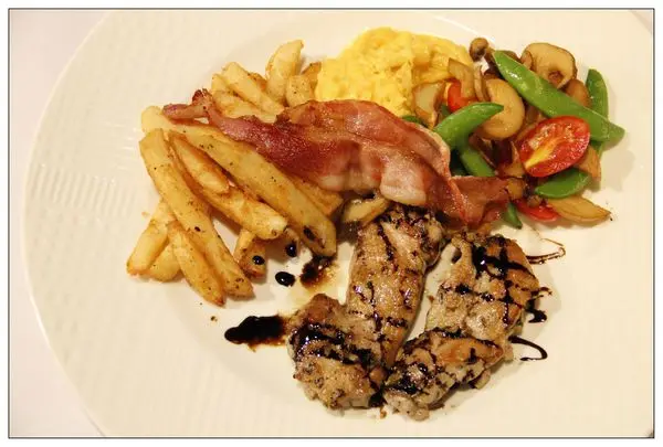 薯條+培根+現炒時蔬+鮮嫩炒蛋+香草雞排