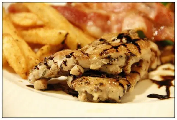 鮮嫩多汁的雞排上方撒上了些許的迷迭香又淋上義式黑醋醬