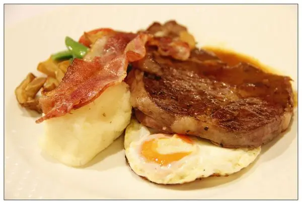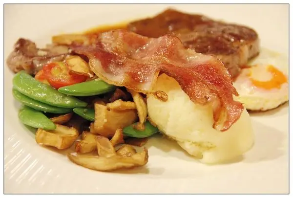 配菜的部分蔡老爺選擇了薯泥和太陽蛋