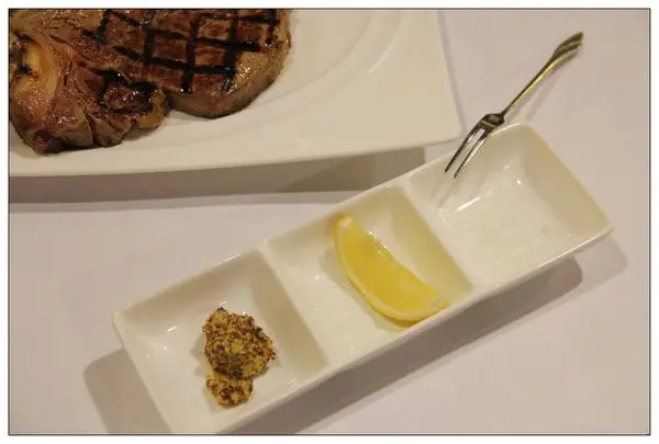 搭配牛排的沾料有頂級鹽之花、芥末籽醬以及新鮮切片檸檬