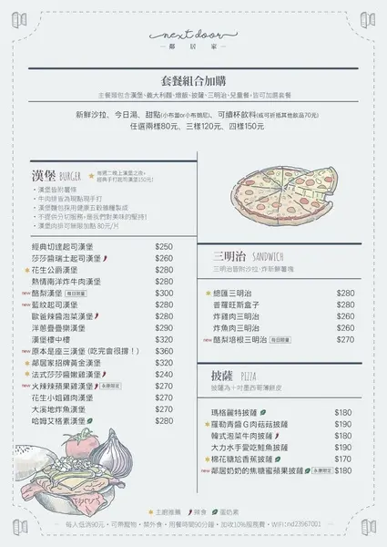 ▲菜單:漢堡、三明治、披薩