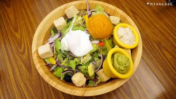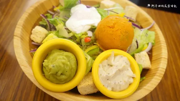 ▲沙拉約4~6人份,有六種醬可以選擇,此次選了凱薩醬跟酪梨醬,凱薩醬永遠是人人可接受的沙拉醬,至於酪梨醬,單純覺得酪梨的營養成分很高才點的,能接受的人只有我...XD非常養身的開胃沙拉,上頭還有一球很大的地瓜泥,不是地瓜球喔旁邊還有一顆水波蛋,裏頭還有很多吐司塊,個人覺得裏頭的洋蔥放得太多,味道搶過整體味道...但整體還是蠻不錯的~