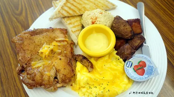 香煎雞腿排煎的金黃酥脆,上頭還撒上起司,起司雞腿排的概念,雞肉非常嫩,但味道清淡了些,稍稍可惜了...一旁還有香烤的土司,可以配上果醬,果醬有奶油/草莓/櫻桃可以選擇,點了奶油卻來了草莓....所以朋友也只單吃吐司而已,炒蛋部分非常滑嫩好吃,還有一球鮪魚沙拉,也是可以配著吐司一起吃,最後還有炸新鮮馬鈴薯,味道不錯,但冷掉有點可惜...整體份量蠻飽足的
