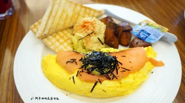 鮭魚是煙燻鮭魚,上頭有青醬,還有撒上海苔絲,看起來非常衝突的,其實意外地搭,歐姆蛋裏頭有洋蔥跟杏鮑菇,歐姆蛋的定義就是外熟內不熟,喜愛吃半熟蛋的朋友都很愛點歐姆蛋系列,主食整體還不錯,吐司跟鮪魚沙拉還有炸馬鈴薯就跟歡樂雞差不多囉!