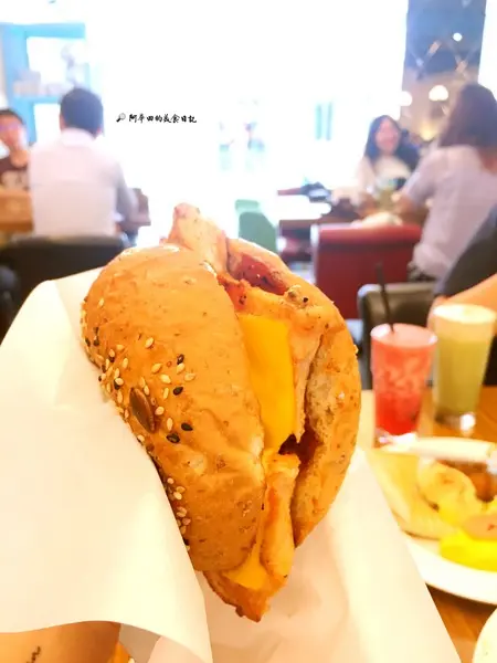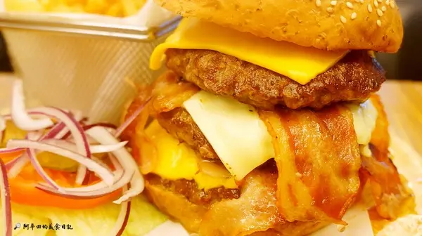 ▲光看名字就覺得很厲害,果然一上桌就吸引了大家的目光,光用看的就飽了...從漢堡麵包看起,它是採用五穀雜糧製成的,非常健康,烤過的麵包也讓口感大大加分,再來內層有三層現點現打的牛肉排,口感紮實且也非常JUICY~也有夾兩片很大片的培根,培根稍微硬了點,但香氣十足,再來仔細一看,起司片有兩種,口感層次非常豐富,如果覺得膩口,一旁也有生菜沙拉可以搭配食用,吃完這個漢堡,下一餐可以省略了...