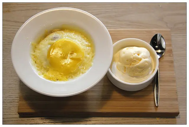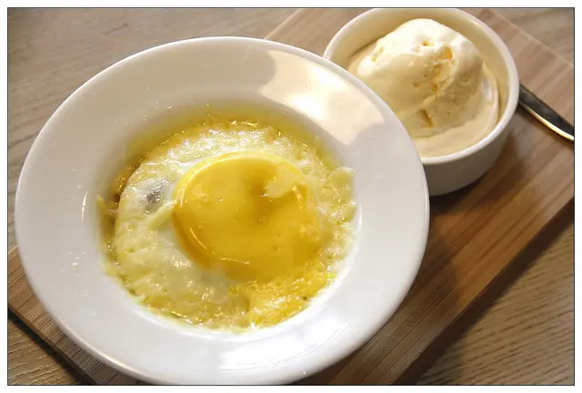 現烤的韓式雞蛋糕上方是全熟的有機蛋並加入了些許的起司