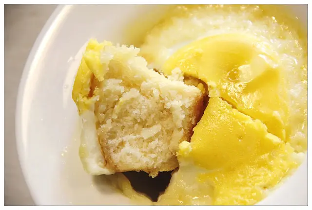 雞蛋糕口感鬆軟紮實~搭配著上方的起司蛋一起入口香氣十足呢!