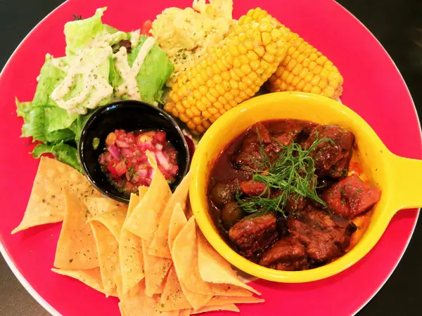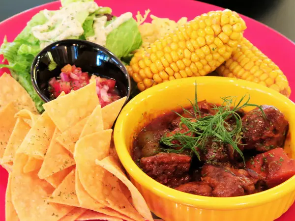 古巴燉牛肉以蔬果香料煨煮的牛腩、搭配ABV特製烤玉米、凱薩沙拉、炒蛋、玉米片