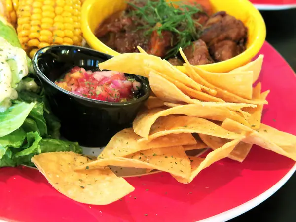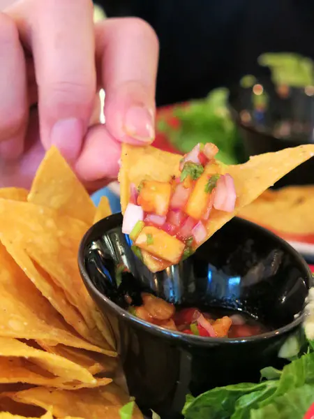 店家特調的莎莎醬滋味真是美賣! 神清氣爽的果香氣、果丁與玉米脆餅交織的爽口感