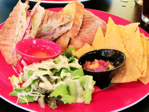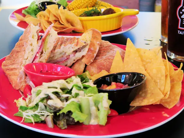 除了古巴三明治、一樣搭配凱薩沙拉、炒蛋、玉米片,錯落有秩的擺盤與大份量,感受中南美洲隨興不羈與自由奔放
