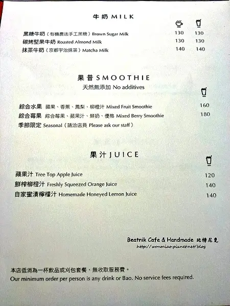 不想喝咖啡或茶飲,也有牛奶果汁或果昔可供選擇,感覺天然無添加的果昔蠻值得一試!