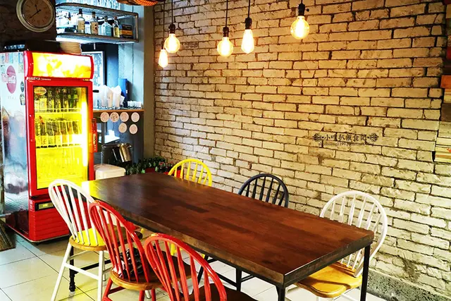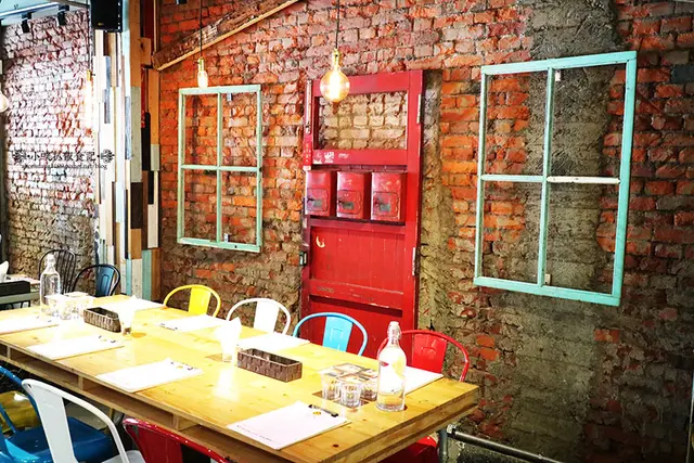 進入店家,展現多元性的裝飾風格,粗曠的紅磚牆面,木質窗框及像裁縫機的鐵椅,感覺顏色繽紛亮麗,有種混搭的的氛圍!!!