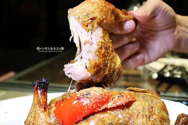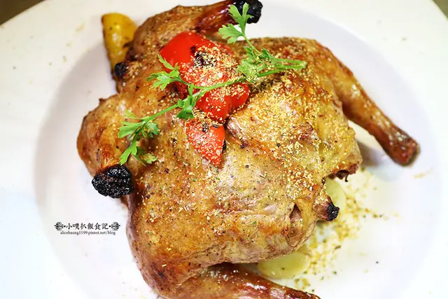 以23種主廚秘製香料,醃製三天三夜,讓雞肉充份吸收醬汁的濃郁氣味,最後,再以大蒜.奶油.紅酒醬塗抹雞身後,放入烤爐中烤製,因此,香氣撲鼻,獨特的香料氣味,讓別桌的客人,都目瞪口呆!!!