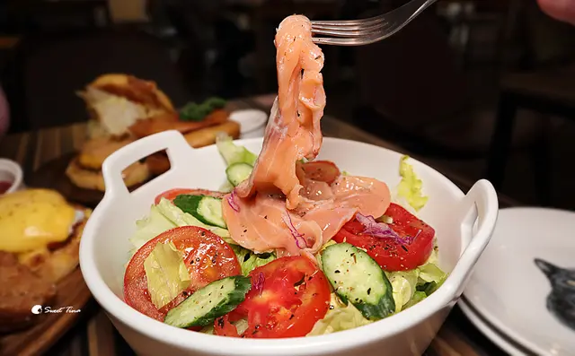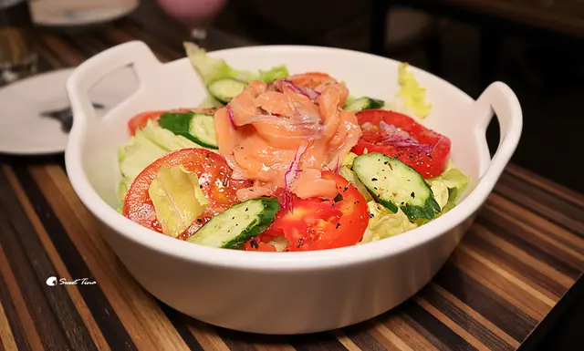 鮭魚油醋沙拉 - 這一盆沙拉真的太有誠意了,生菜份量十足,連上頭的鮭魚也不少耶,吃完會有飽足感喔。