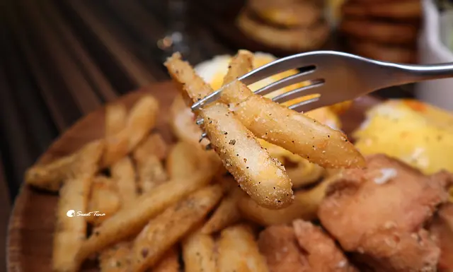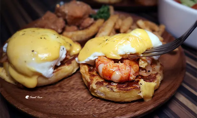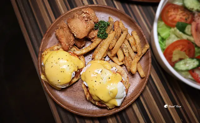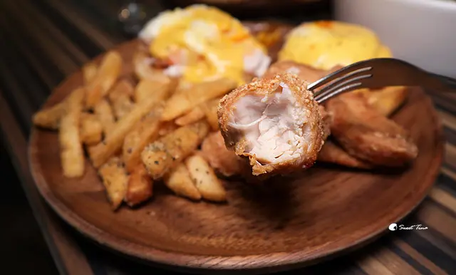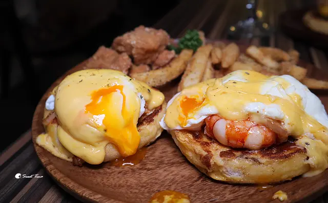 天使蝦水波蛋 - 選擇的配菜是炸雞、炸薯條,調味上適宜,吃起來也不會過於油膩。